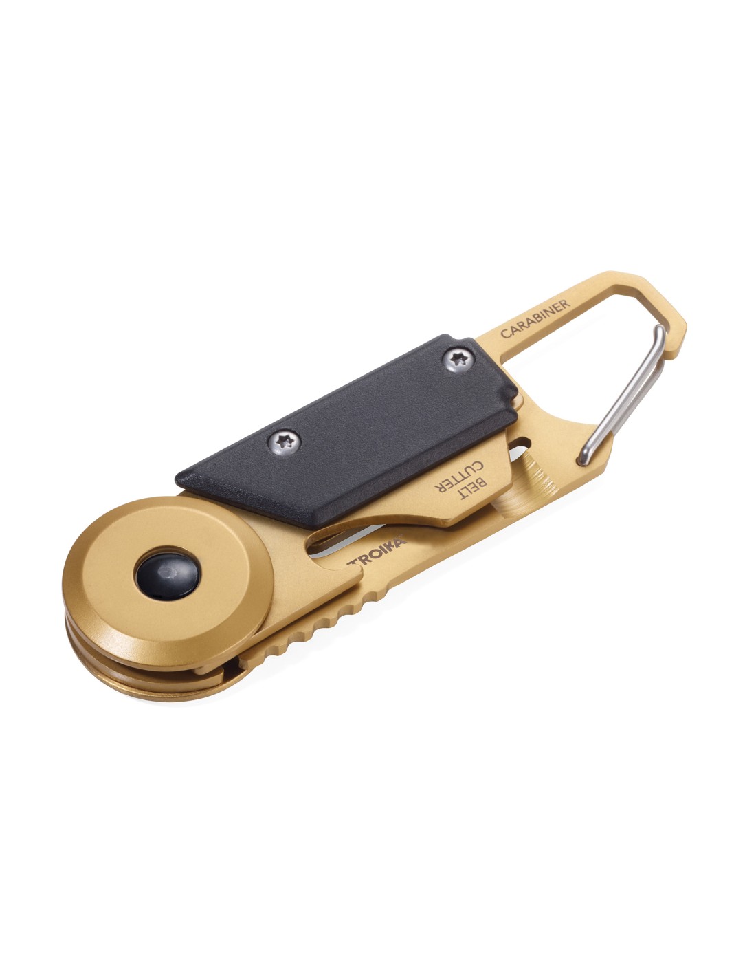 Mini-Werkzeug mit 5 Funktionen, Paketmesser, Karabinerhaken, kleine Sägeklinge, Schlitz-Schraubendreher, Flaschenöffner, 420 Edelstahl, Aluminium, goldfarben/schwarz