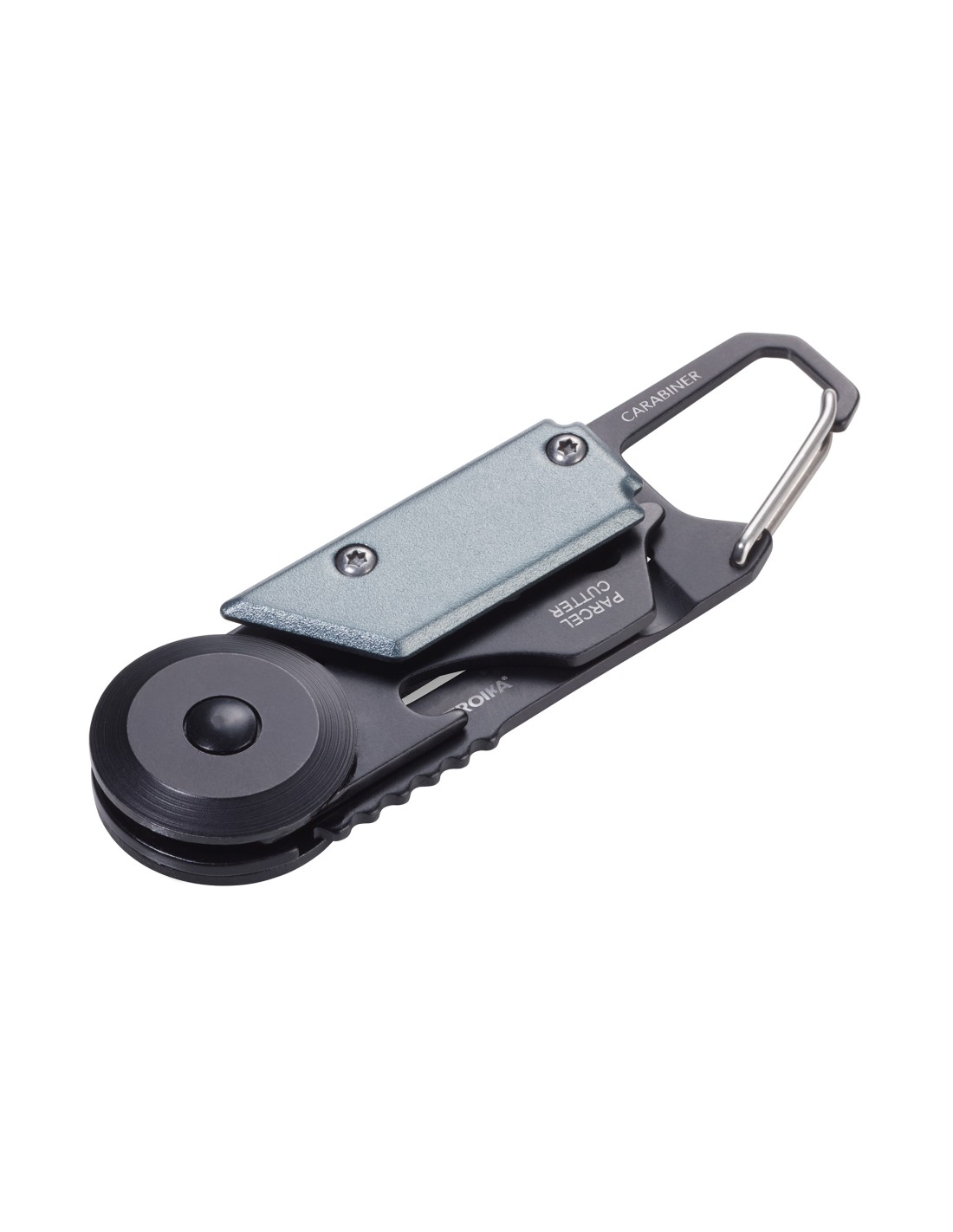 Mini-Werkzeug mit 5 Funktionen, Paketmesser, Karabinerhaken, kleine Sägeklinge, Schlitz-Schraubendreher, Flaschenöffner, 420 Edelstahl, Aluminium, schwarz/titanfarben