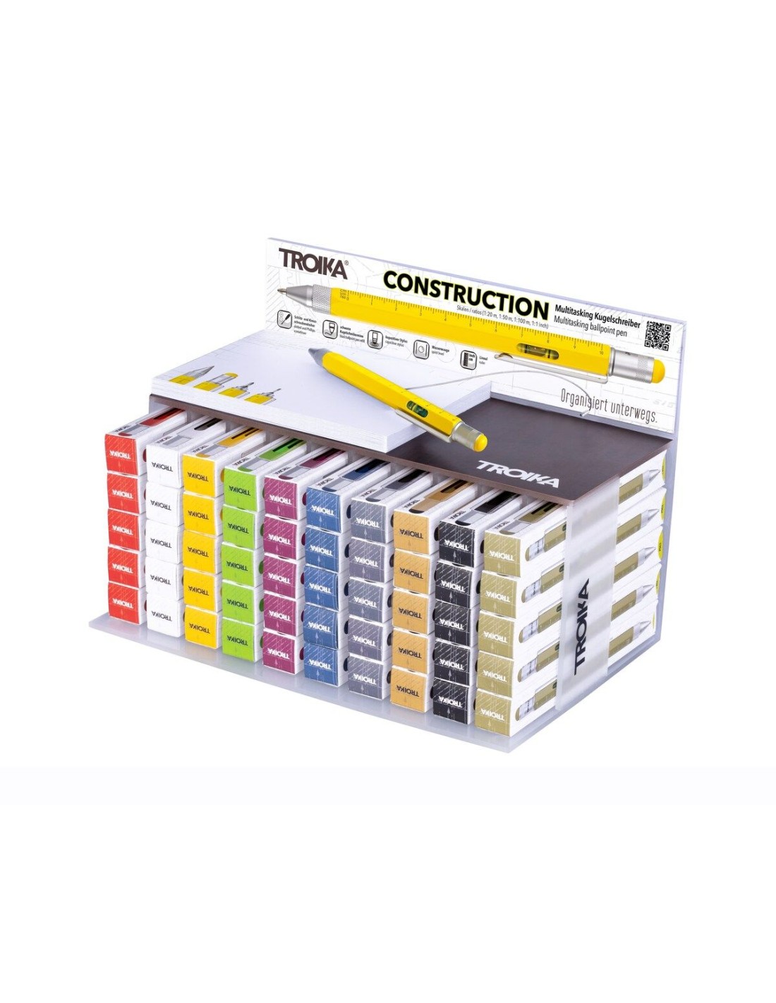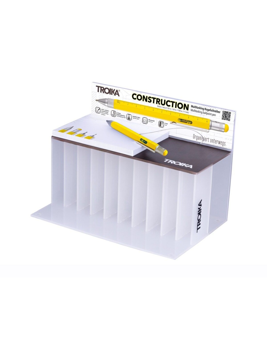 Thekendisplay zur Präsentation von 50 Multitasking-Kugelschreibern CONSTRUCTION, 10 Fächer mit je 5 x PIP20/RD,../SI,../YE,../NG,../OF,../BL,../TI,../AB,../BK,../OO, 1 DIN A6 Schreibblock (80g/m², 100 Seiten) konfektioniert + 1 Schreibblock Ersatz, 1 gesicherter PIP20/YE (gelb) als Testmuster, zur Selbstbedienung, TROIKA Logo/Erklärung/Video QR-Code, Acryl, matt, Mehrfarbig