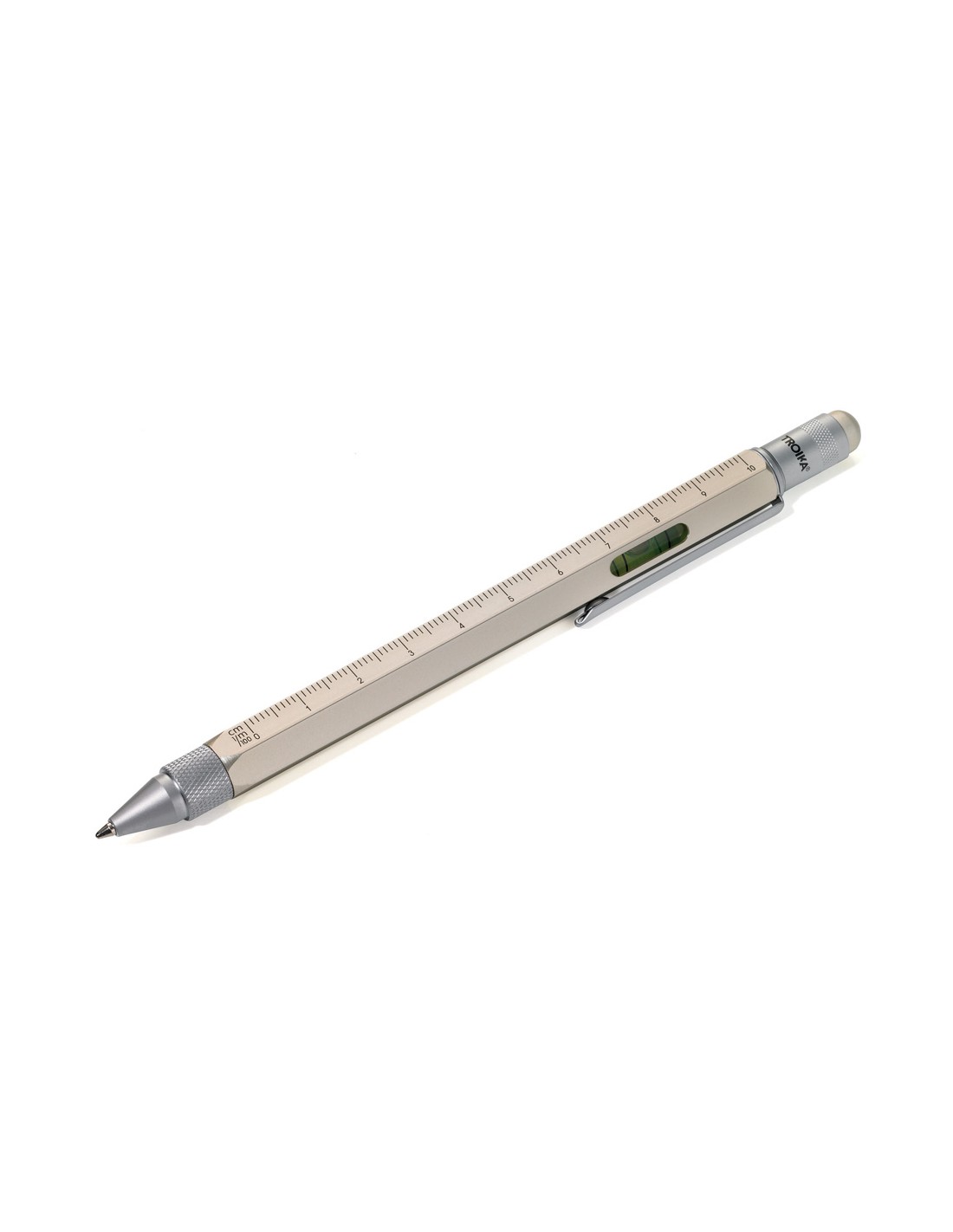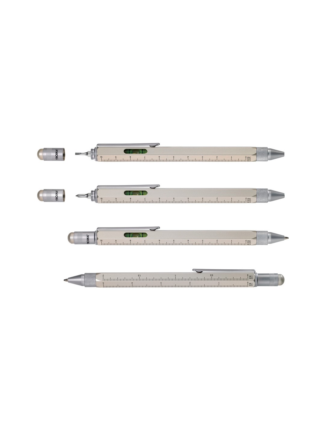Stylo à bille multitâche, règle en centimètres/en pouces, échelle 1:20 m/1:50 m, niveau à bulle, tournevis plat/cruciforme, stylet, mine noire, laiton