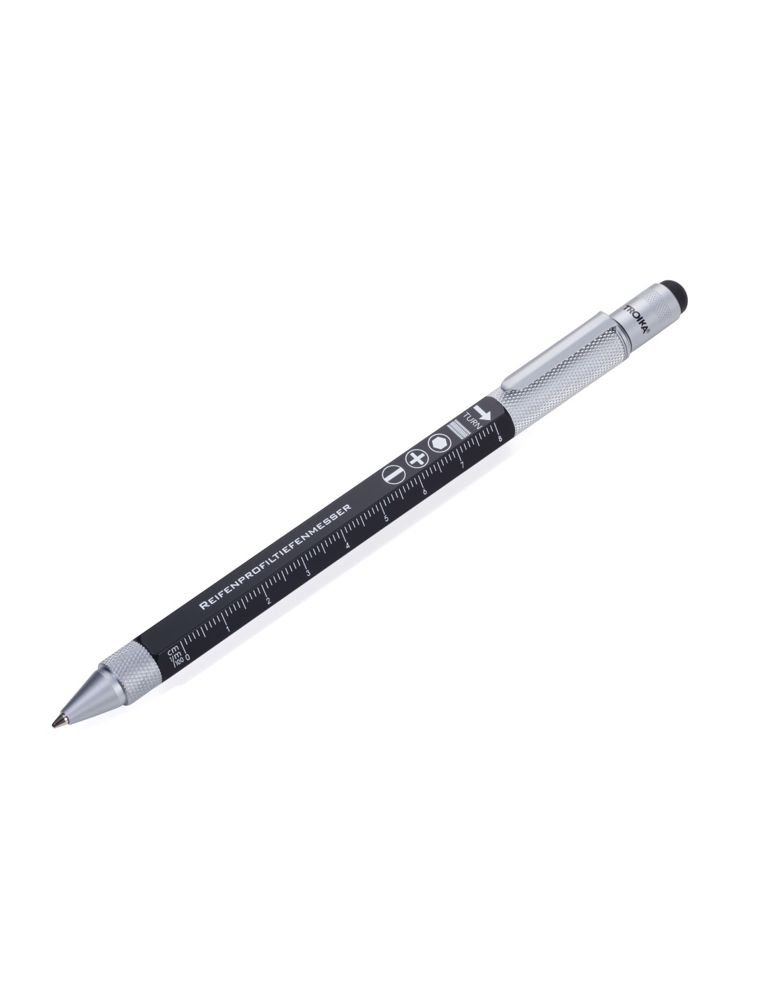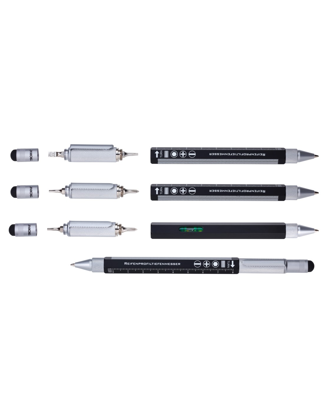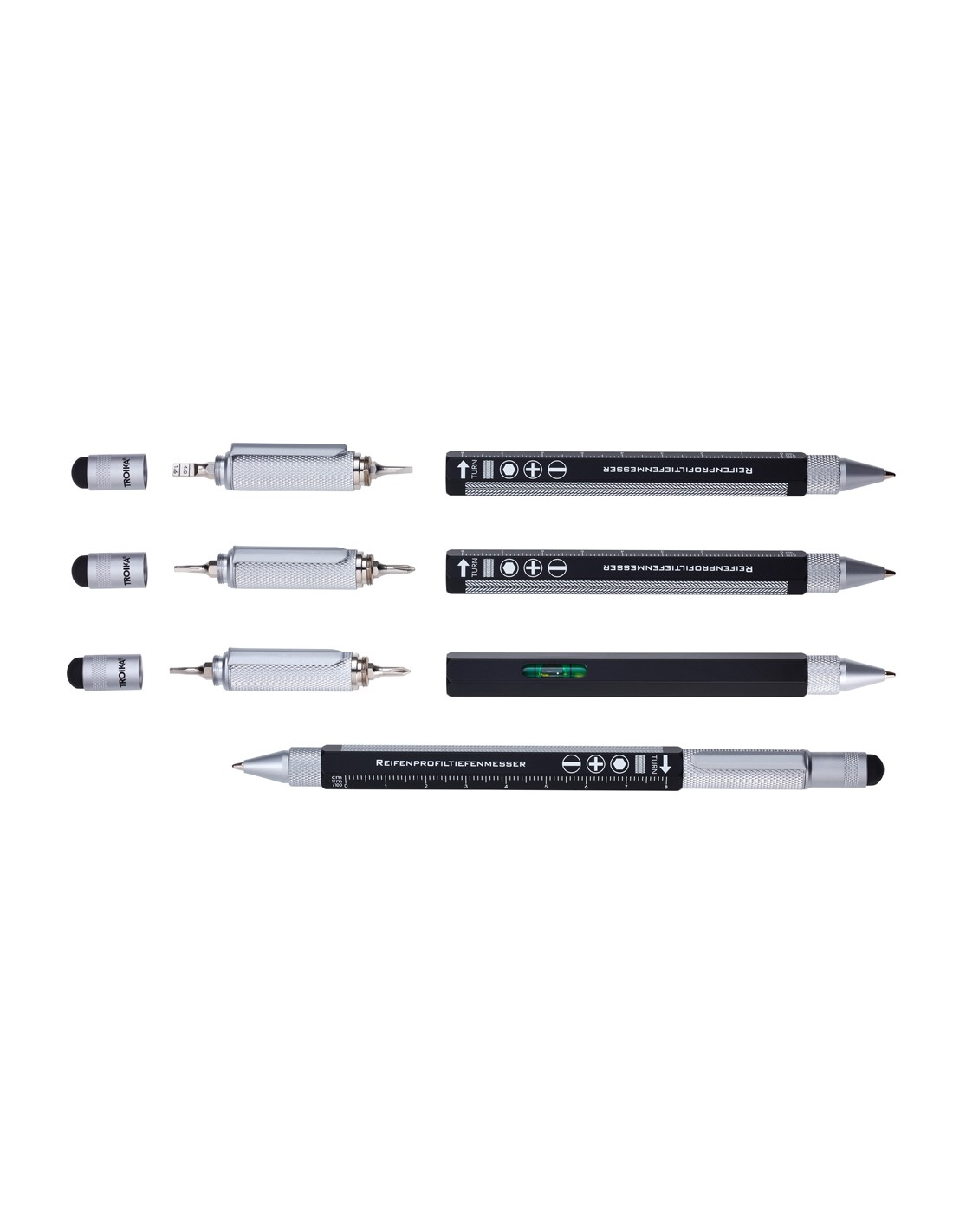 Stylo à bille multitâche, règle (cm), tournevis plat/cruciforme, pneu de jauge de profondeur, tournevis Allen (1,5 mm), niveau à bulle, stylet, mine noire, laiton, impriméargent/noire