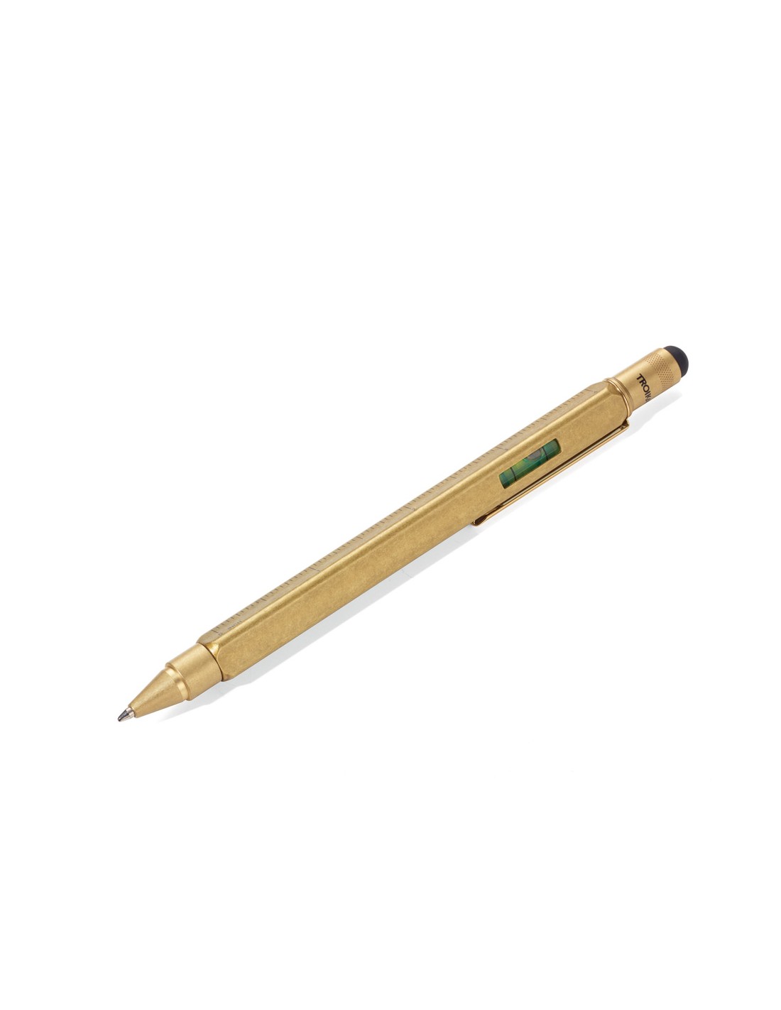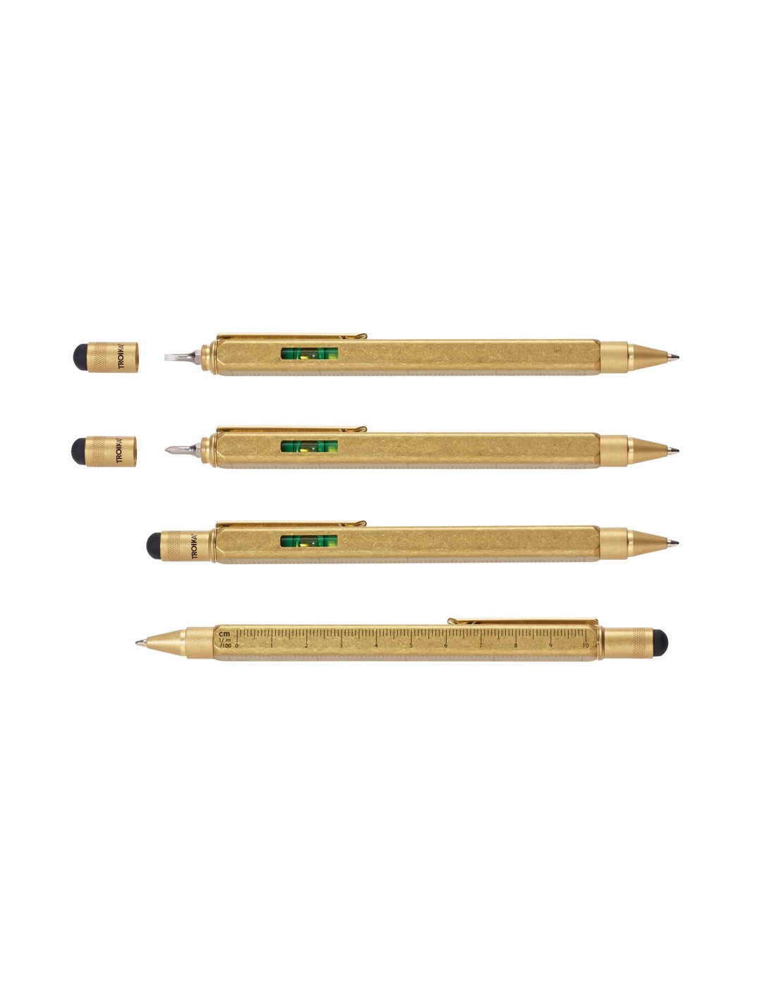 Stylo à bille multitâche, carré, règle en centimètres/en pouces, niveau à bulle, stylet, tournevis plat/cruciforme, mine noire, laiton, poli, mat, laiton antique