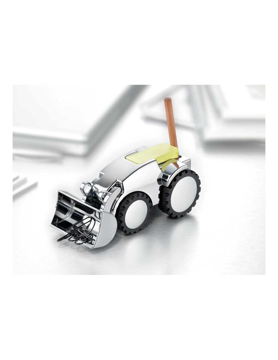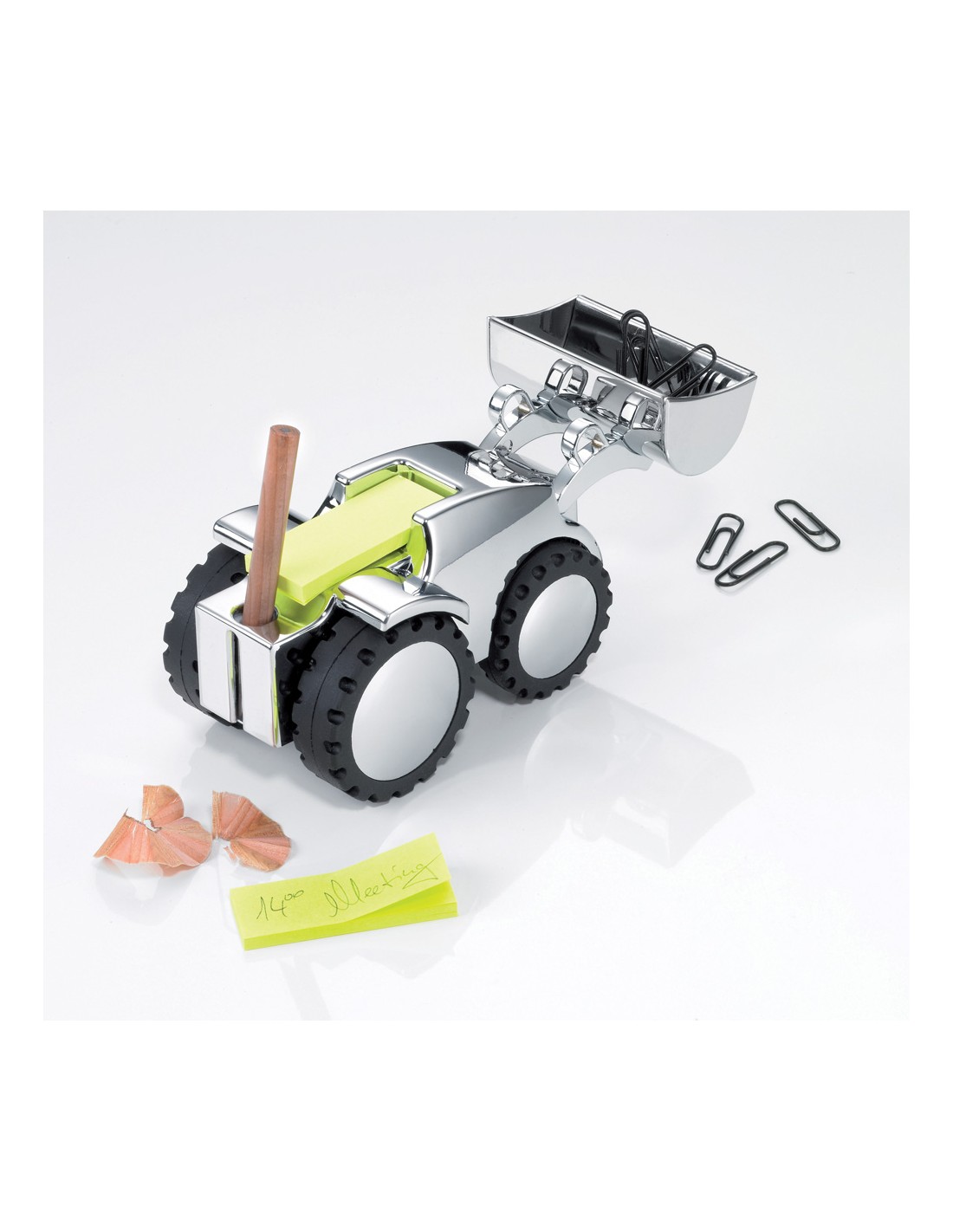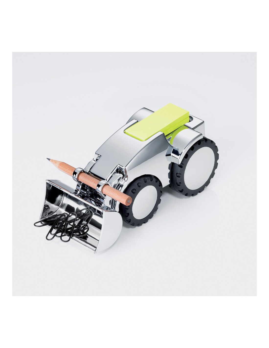 Distributeur de trombones, tractopelle, pelle amovible, presse-papiers, porte-stylos incl. 1 crayon, taille-crayon, distributeur de notes incl. 80 notes repositionables (jaunes), aimant pour les trombones, fonte métallique, brillant, argent/noire