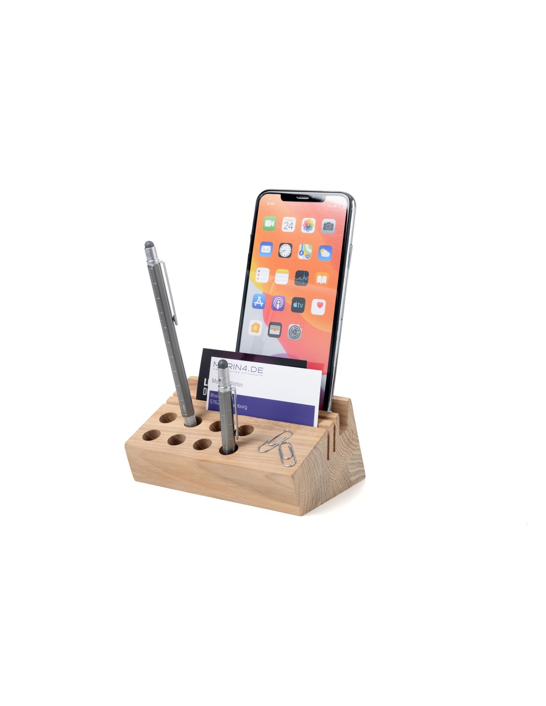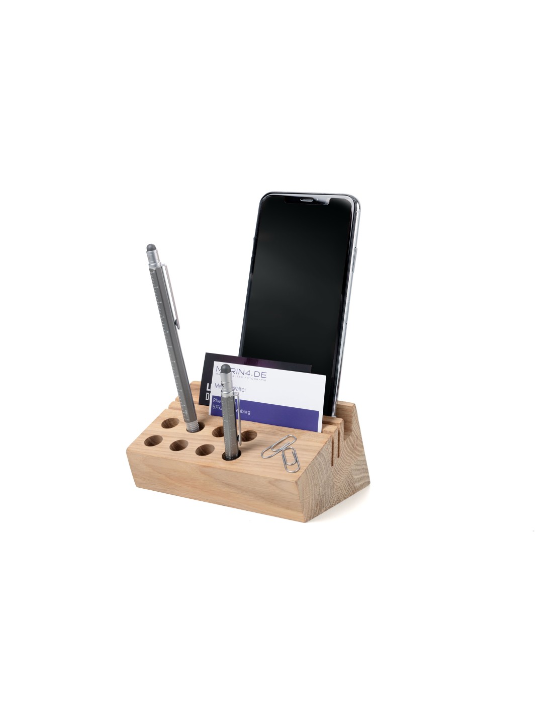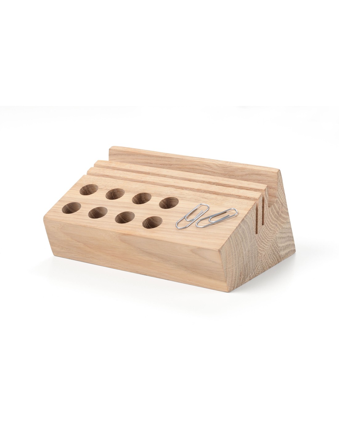 Organiseur de bureau, 8 trous pour stylos, coupe-papier, etc., 2 fentes étroites pour cartes, lettres et photos, 1 large rainure comme support pour smartphone, surface magnétique pour trombones (2 trombones inclus), massif, travail manuel complexe, Bois de chêne certifié FSC provenant de forêts gérées durablement en Lituanie, bois de chêne, mat, marron