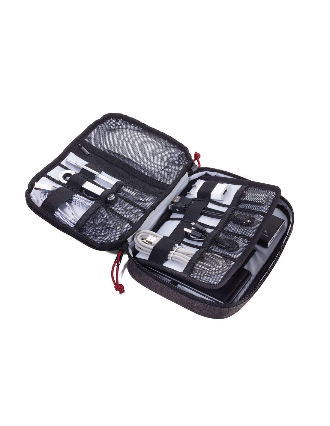 Pochette pour câbles d'accessoires électroniques avec fermeture à glissière et poignée de transport, intérieur : compartiment en filet avec fermeture à glissière, 1 compartiment intérieur avec fermeture velcro, cloison avec poches + rubans élastiques, poche avant avec fermeture à glissière, polyester, anthracite/noire