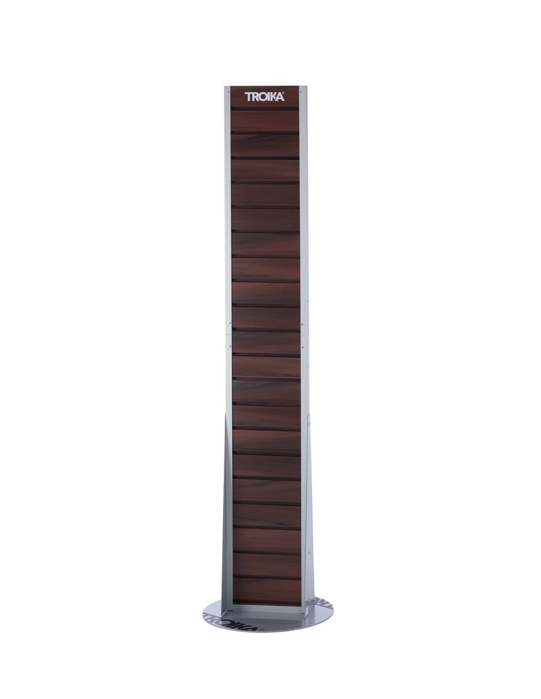 Présentoir au sol en libre-service, bardage à lames deux côtés, aspect bois, pour euro-crochets (10F306, 10F307, 10F308, 10F312), pour étagères (10F311), support de base (rondes), avec logo TROIKA, séparables, plastique/aluminium/acier, mat, argent/marron