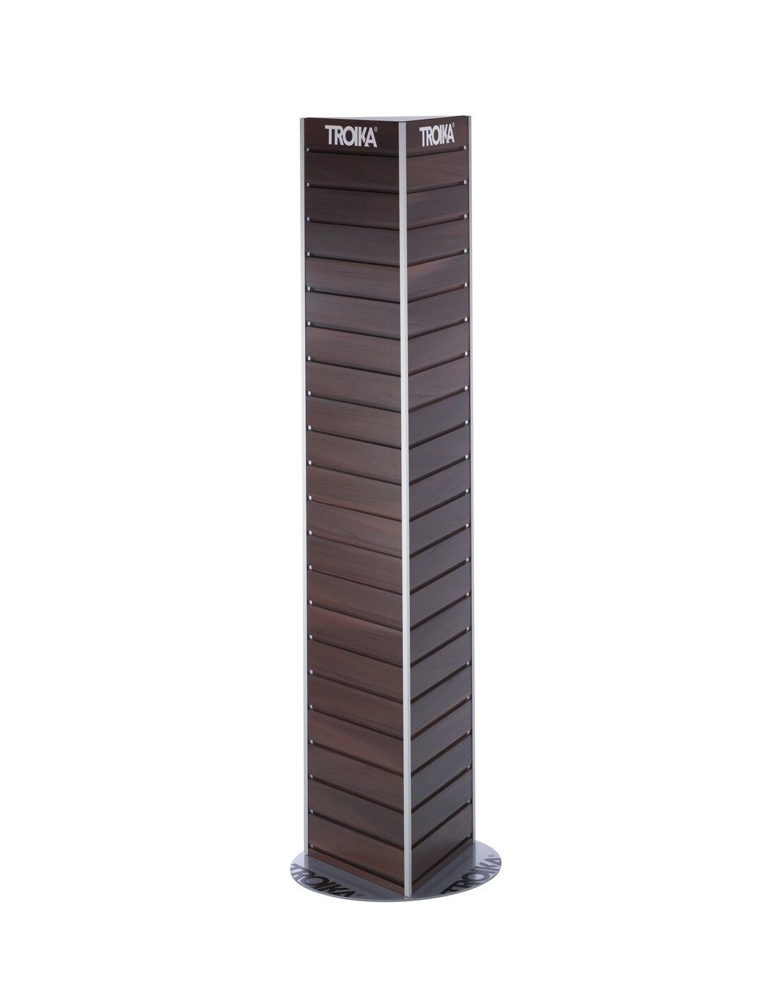 Présentoir au sol en libre-ervice, bardage à lames trois côtés, aspect bois, pour euro-crochets (10F306, 10F307, 10F308, 10F312), pour étagères (10F309, 10F311), support de base (rondes), avec logo TROIKA, pivotant, plastique/aluminium/acier, mat, argent/marron