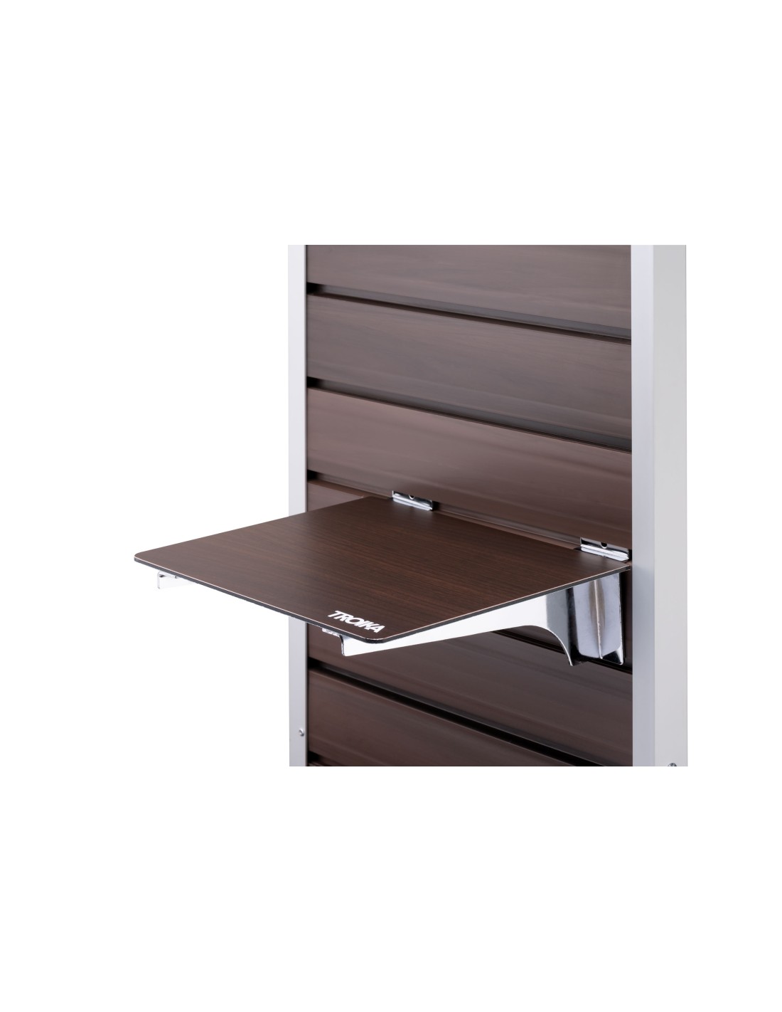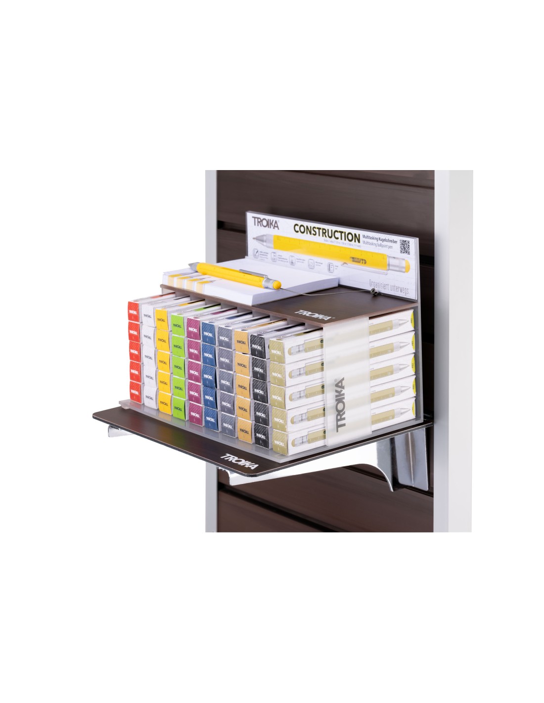Etagère pour FREERAIL mur à lamelles, spécialement conçu pour le présentoir longue durée PIP20-SET01 (présentoir de comptoir pour 50 stylos à bille multitâches CONSTRUCTION), largeur 210 mm, modèle stable avec supports métalliques, Logo TROIKA, aluminium, plastique, marron