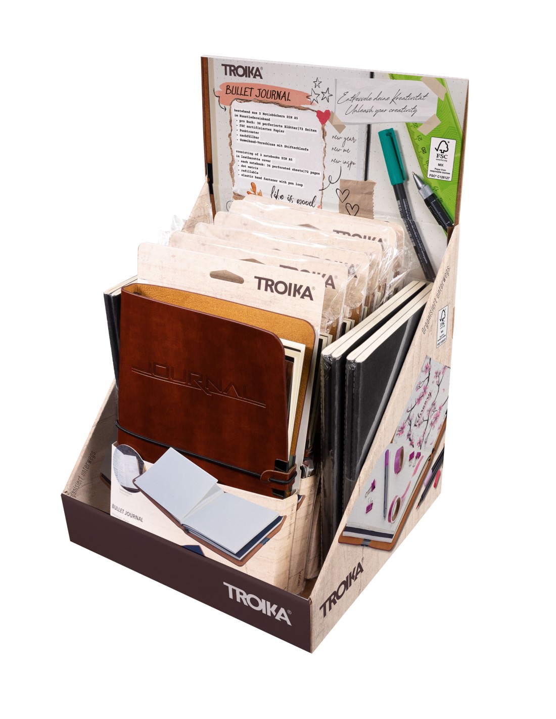 Présentoir de comptoir incl. 6 x TROIKA BULLET JOURNAL (BTJ36/BR) et 4 x set de 2 carnets de rechange DIN A5 (/BOOK JOURNAL SET BK), prétrié, en libre-service, carton, imprimé, mat, multicolore