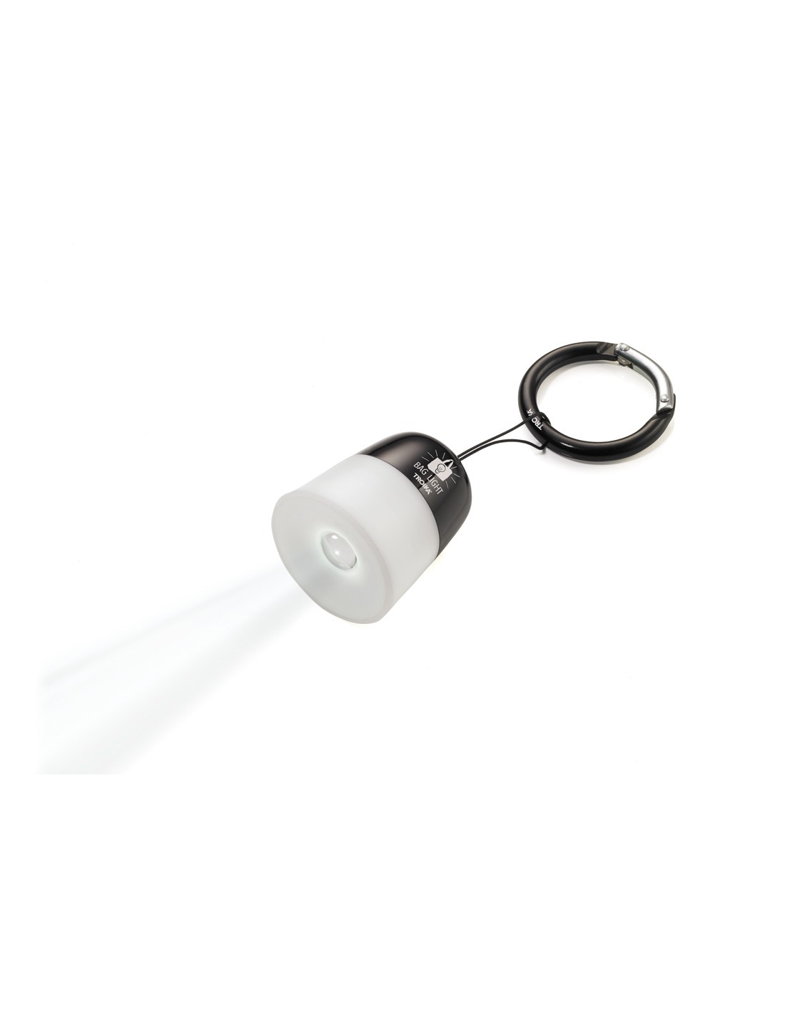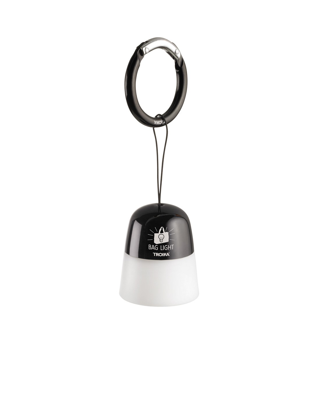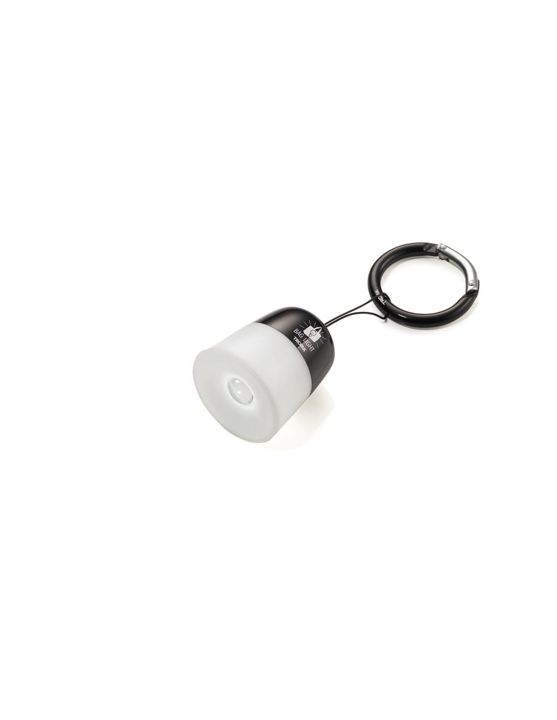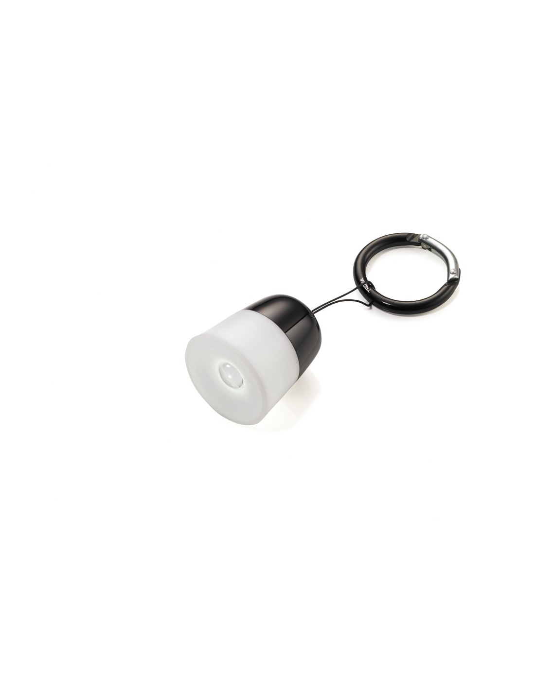Lampe de poche et bijou de sac, lampe à suspension avec son cordon, LED blanche, allumer/éteindre en tirant sur la lampe, mousqueton, métal, plastique, noire