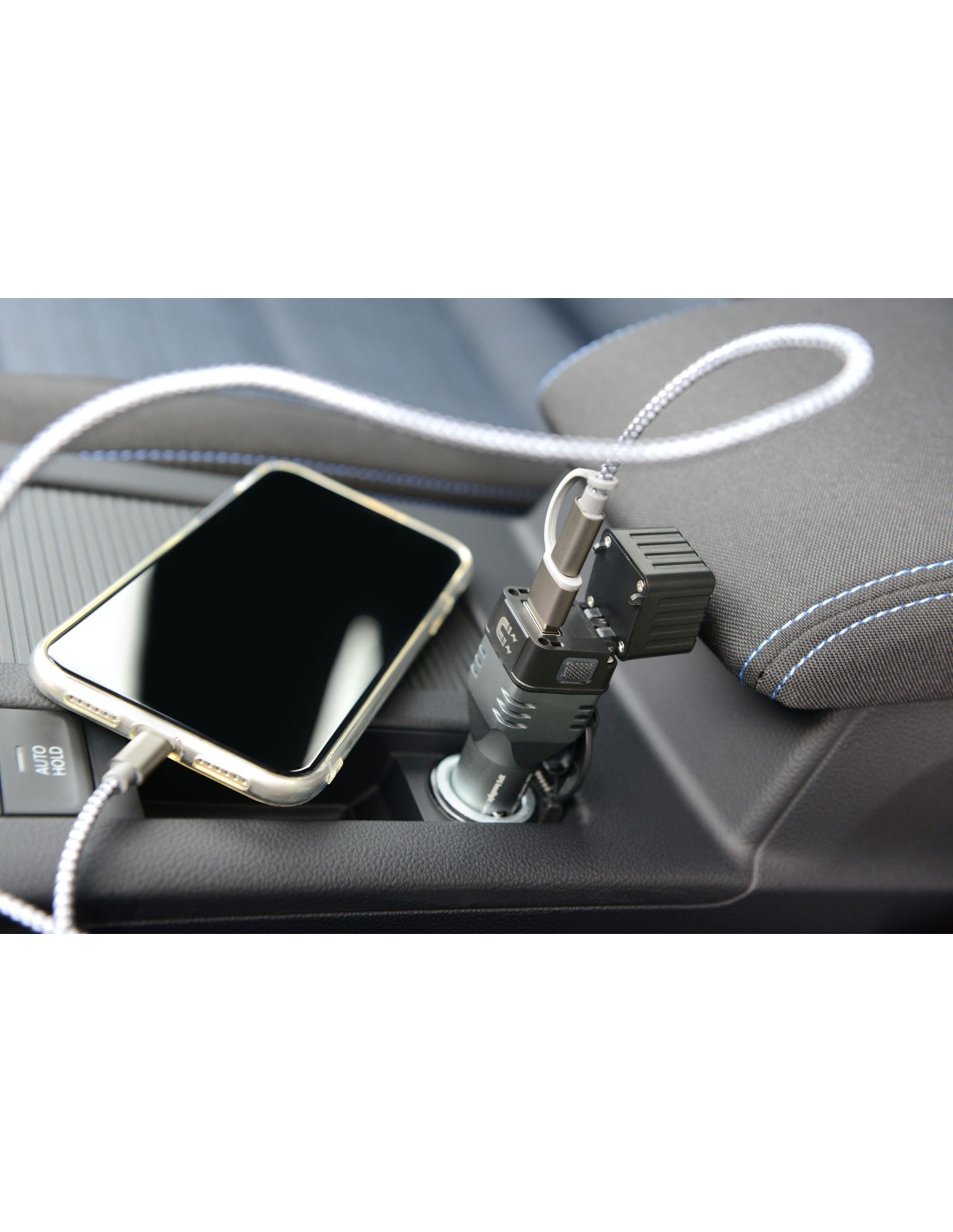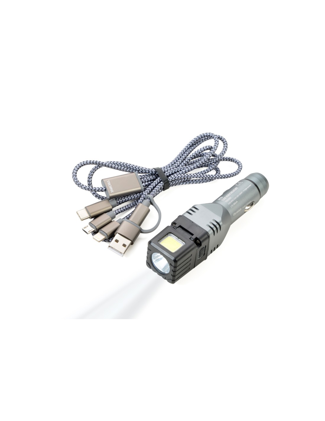 Lampe de poche repliable pour la voiture, 4 fonctions d'éclairage, lampe avant : 100 % de lumière + 50 % de lumière, clignotant (LED blanche, 150 lumens), lampe de travail latérale LED COB (120 lumens), tête d'éclairage inclinable jusqu'à 90° pour un éclairage optimal, fonction magnétique, dévissez le couvercle à l'extrémité pour le chargement de la batterie et le brise-glace (acier au tungstène, batterie lithium-ion 800 mAh, écologique, car elle peut être rechargée via 12 V, anti-éclaboussures (IPX4 imperméable), avec câble de charge TROIKA DREIZACK 3 en 1 - pour charger simultanément jusqu'à 3 appareils dans la voiture (lampe 12V sert d'adaptateur + USB vers Micro-USB/Lightning/USB-C), aluminium, plastique, mat, couleur titane